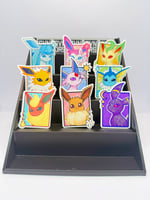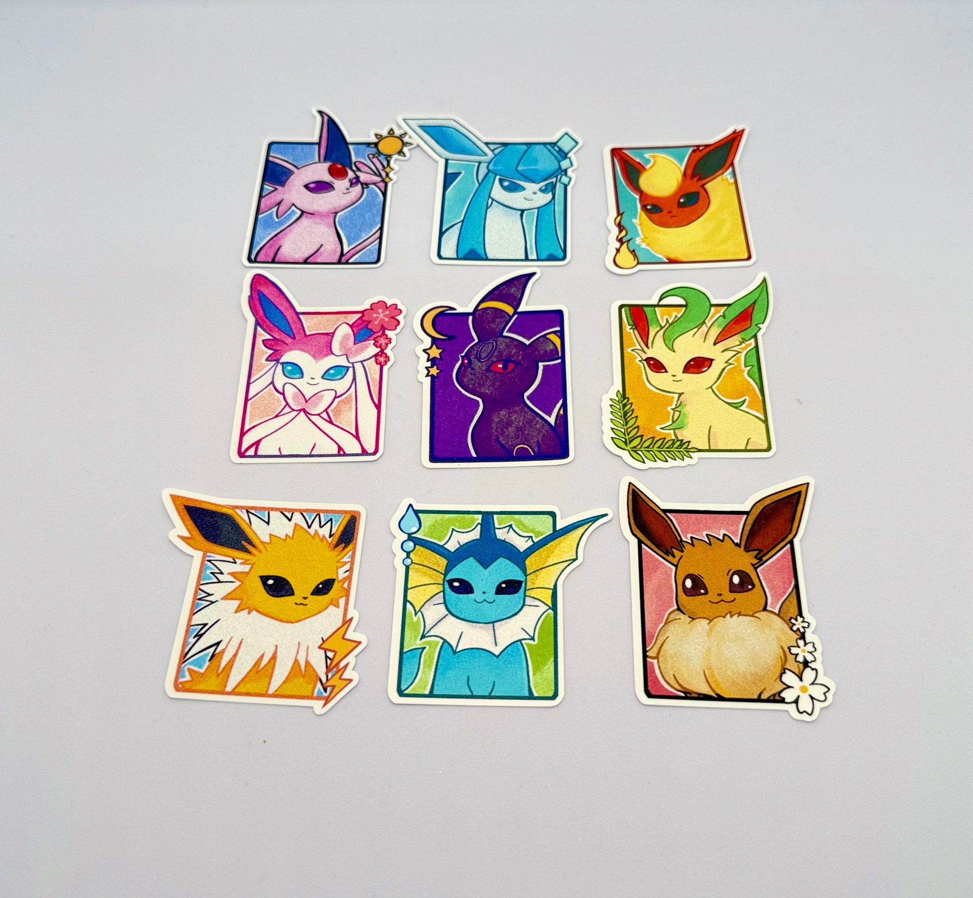 Bring your favorite eeveelution companions to life with this clean, dynamic sticker collection. Each design features a beautifully framed portrait with the character playfully breaking out of its borders. Available individually to mix and match, or as a complete 9-piece bundle for the ultimate collection. These stickers are designed with a vibrant, polished aesthetic to perfectly elevate your TCG gear, deck boxes, or everyday accessories.